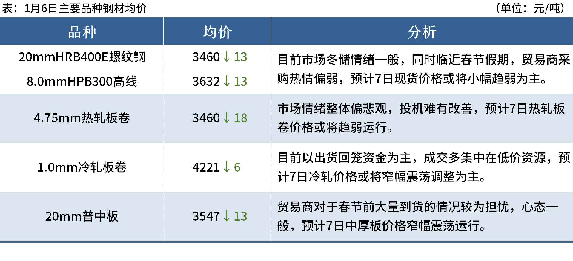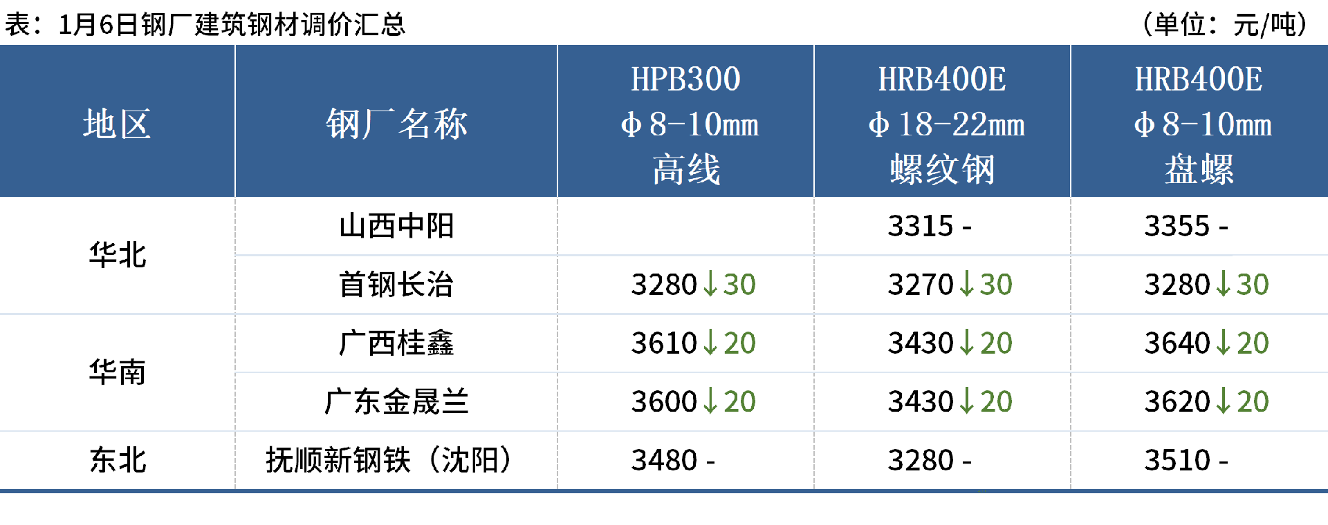 ◎1月6日,午后唐山遷安普方坯資源出廠含稅下調(diào)20元/噸,報(bào)2990元/噸。