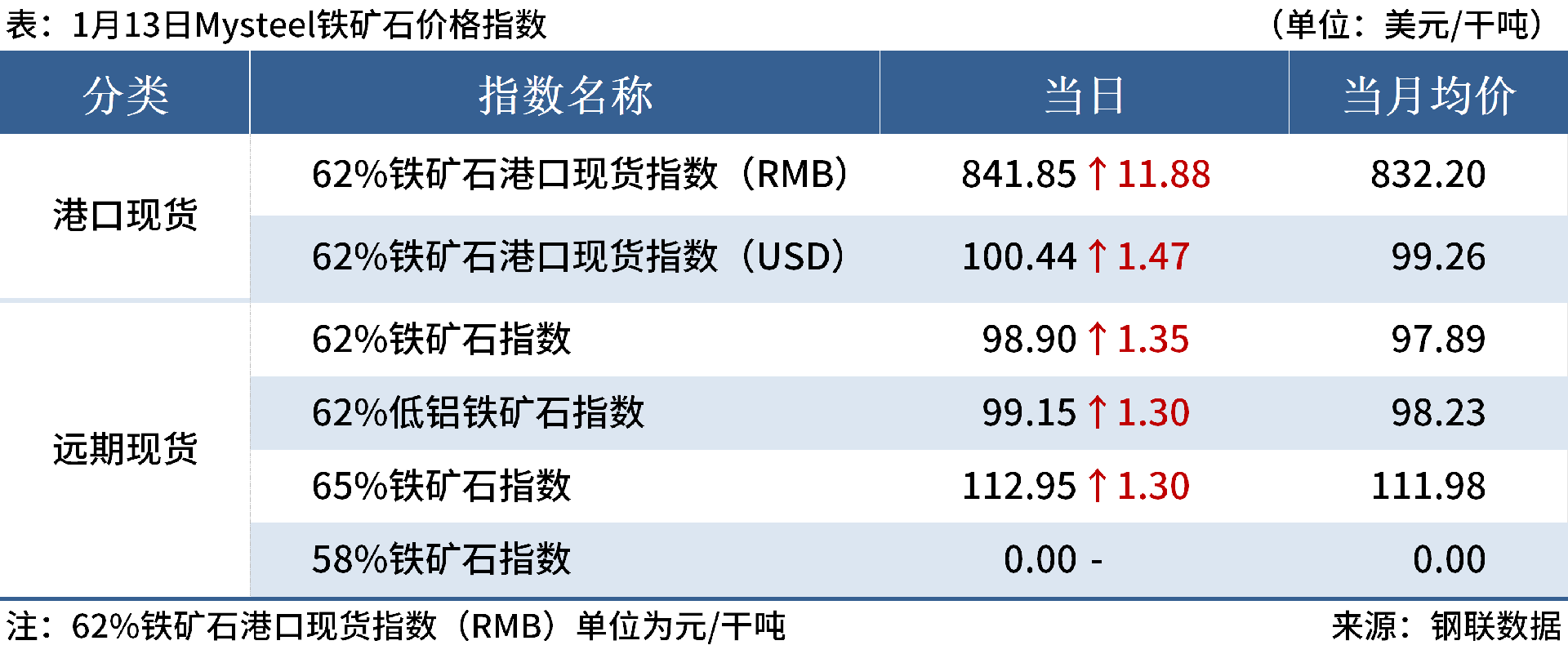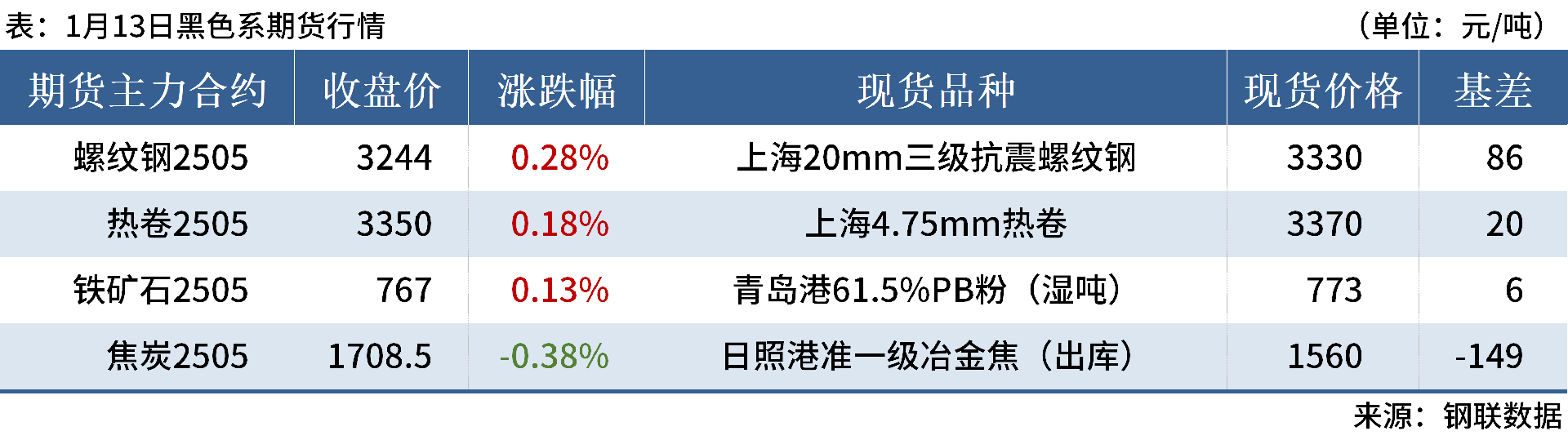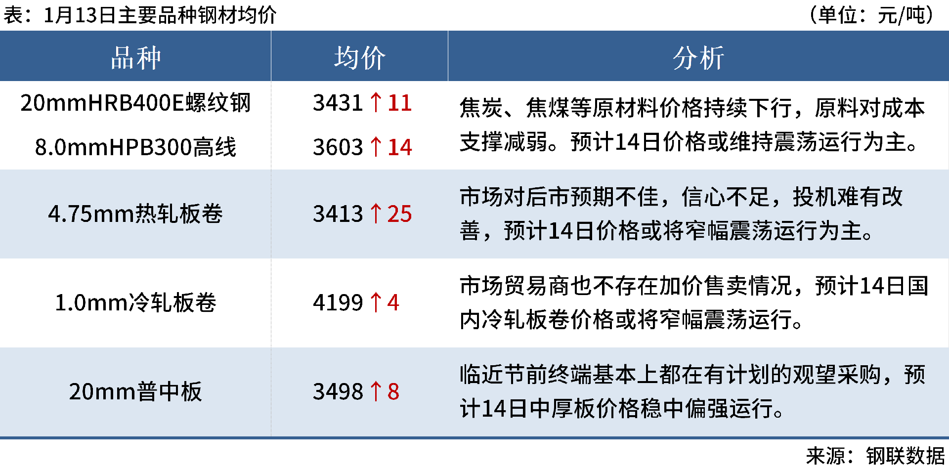 ◎ 1月13日,全國主港鐵礦石成交80.18萬噸,環(huán)比增2.1%;237家主流貿(mào)易商建筑鋼材成交8.70萬噸,環(huán)比增12.2%。