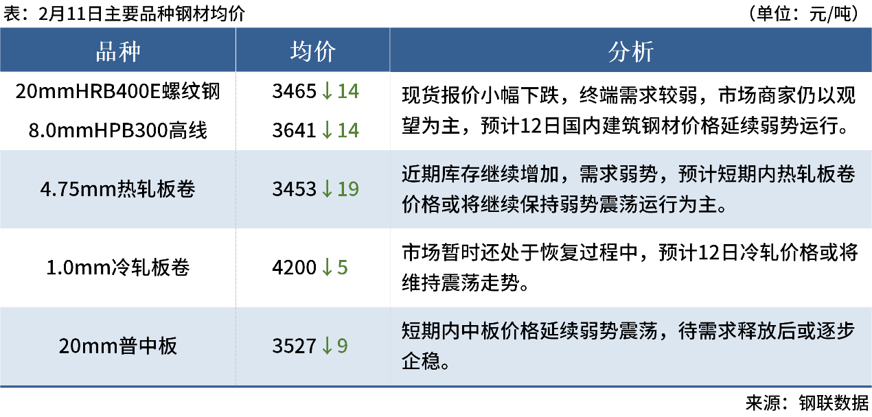 ◎2月11日,唐山遷安普方坯資源出廠含稅下調(diào)30元/噸,報(bào)3040元/噸。