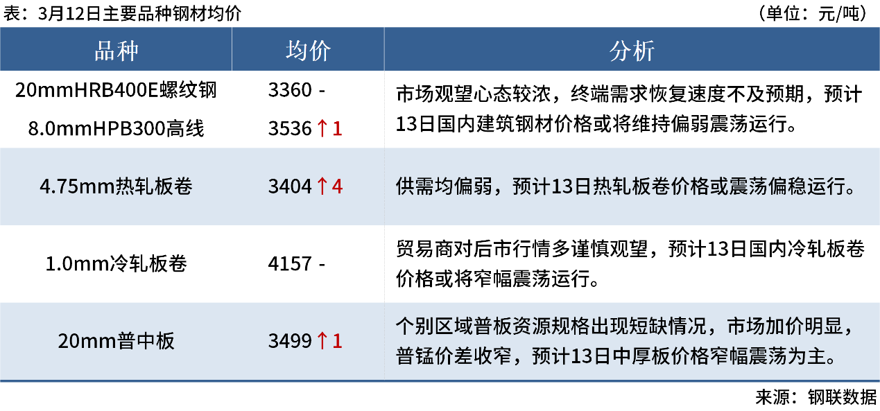 ◎3月12日,唐山遷安普方坯資源出廠含稅上調(diào)20元/噸,報(bào)3040元/噸。