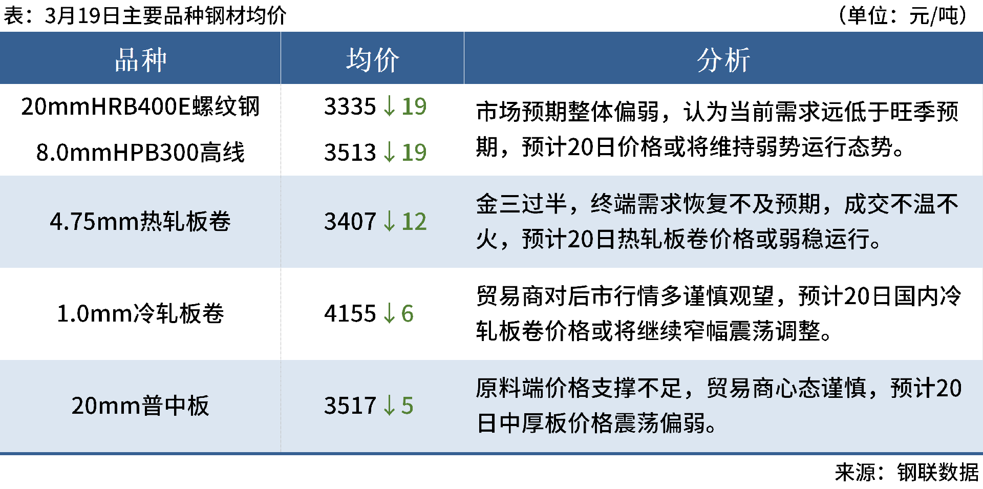 ◎ 3月19日,江蘇沙鋼廢鋼采購價格下調(diào)30元/噸,調(diào)后重三含稅2370元/噸,爐一含稅2450元/噸。