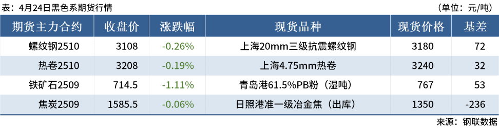 ◎4月24日,全國主港鐵礦石成交97.50萬噸,環(huán)比減8.1%;237家主流貿(mào)易商建筑鋼材成交10.06萬噸,環(huán)比減28.7%。
