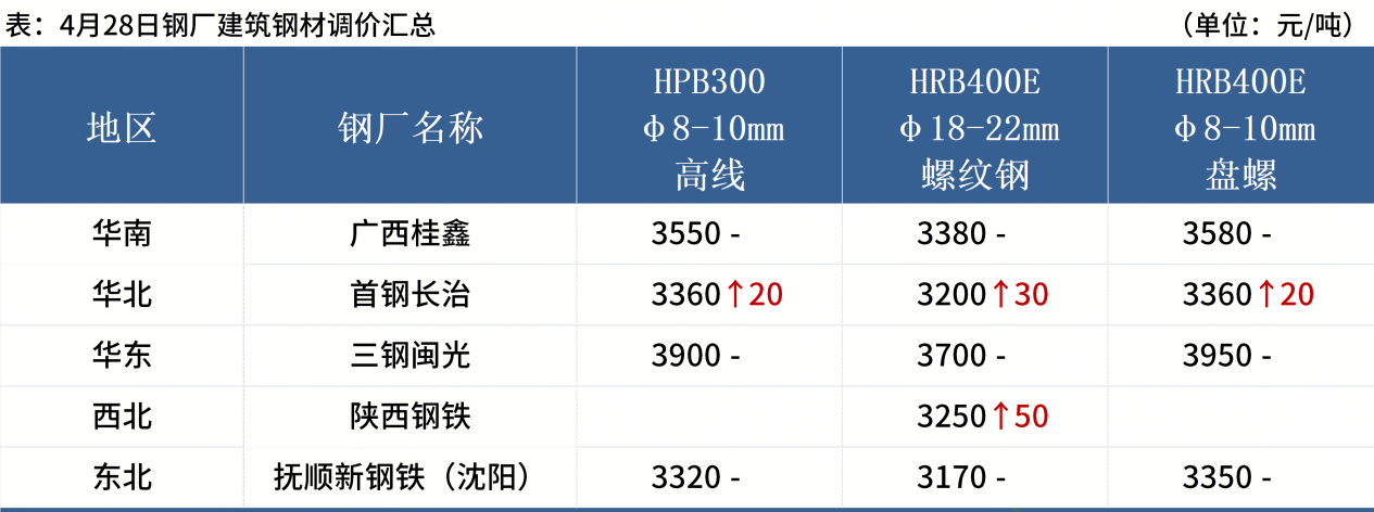 ◎ 云南部分鋼廠調(diào)整螺紋鋼級差:HRB400E和HRB500E螺紋鋼Ф16、Ф20、Ф22、Ф25 規(guī)格在Ф18規(guī)格基礎上由原來加價80元/噸調(diào)整為加價100元/噸,4月28日起執(zhí)行。詳情>>