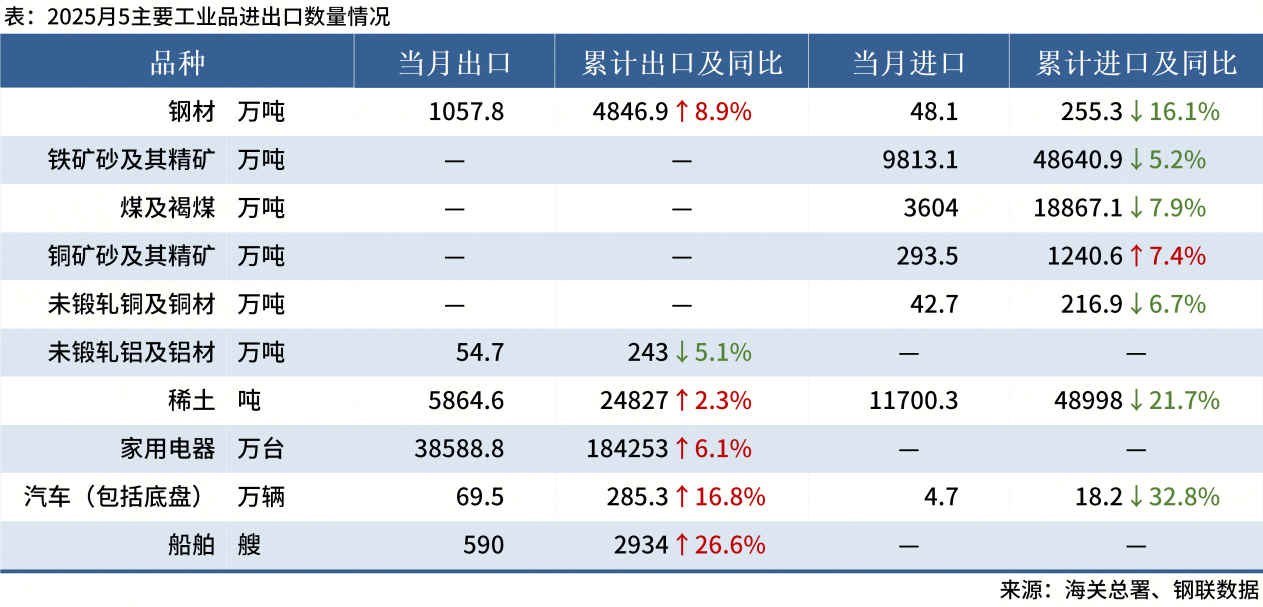 ◎ 海關(guān)總署:2025年5月中國出口鋼材1057.8萬噸,環(huán)比增長1.1%;1-5月累計出口鋼材4846.9萬噸,同比增長8.9%。其他主要產(chǎn)品進(jìn)出口情況如下: