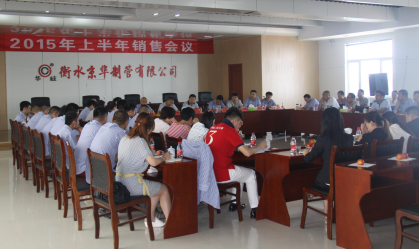 7月4日上午9點,衡水京華制管有限公司業(yè)務(wù)經(jīng)理會議在辦公樓五樓會議室隆重召開??偨?jīng)理溫朝福、常務(wù)副總于占軍、鄭州京華副總經(jīng)理翟永利等多位領(lǐng)導(dǎo)以及京華全體業(yè)務(wù)經(jīng)理共50余人參加了本次會議。會議由供銷副總趙志強(qiáng)主持。會議首先由常務(wù)副總于占軍對2015年上半年工作進(jìn)行總結(jié)以及下半年的銷售工作方向作出發(fā)言。隨后依次由供銷副總趙···