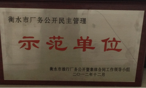 衡水市推行廠務(wù)公開(kāi)暨集體合同工作領(lǐng)導(dǎo)小組表彰了一批廠務(wù)公開(kāi)民主管理工作先進(jìn)集體和先進(jìn)個(gè)人,衡水京華制管有限公司被授予“衡水市廠務(wù)公開(kāi)民主管理示范單位”稱(chēng)號(hào)。衡水市推行廠務(wù)公開(kāi)暨集體合同工作領(lǐng)導(dǎo)小組表彰了一批廠務(wù)公開(kāi)民主管理工作先進(jìn)集體和先進(jìn)個(gè)人,衡水京華制管有限公司被授予“衡水市廠務(wù)公開(kāi)民主管理示范單位”稱(chēng)號(hào)。 近年來(lái)···