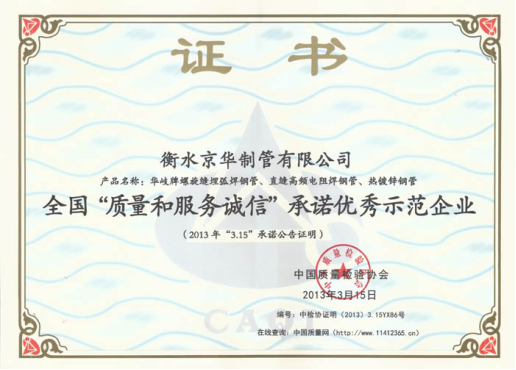 近日,衡水京華制管有限公司被中國(guó)質(zhì)量檢驗(yàn)協(xié)會(huì)授予“全國(guó)質(zhì)量誠(chéng)信承諾優(yōu)秀企業(yè)”稱(chēng)號(hào),公司主營(yíng)產(chǎn)品華岐牌螺旋縫埋弧焊鋼管、直縫電阻焊鋼管、熱鍍鋅鋼管產(chǎn)品。 時(shí)值“3.15國(guó)際消費(fèi)者權(quán)益日”之際,衡水京華一如既往地把好質(zhì)量關(guān),秉承“誠(chéng)信雙贏、快速行動(dòng)、持續(xù)溝通、贏得忠誠(chéng)”的服務(wù)方針,為用戶(hù)提供高品質(zhì)的產(chǎn)品及服務(wù)。 證書(shū)在線(xiàn)···